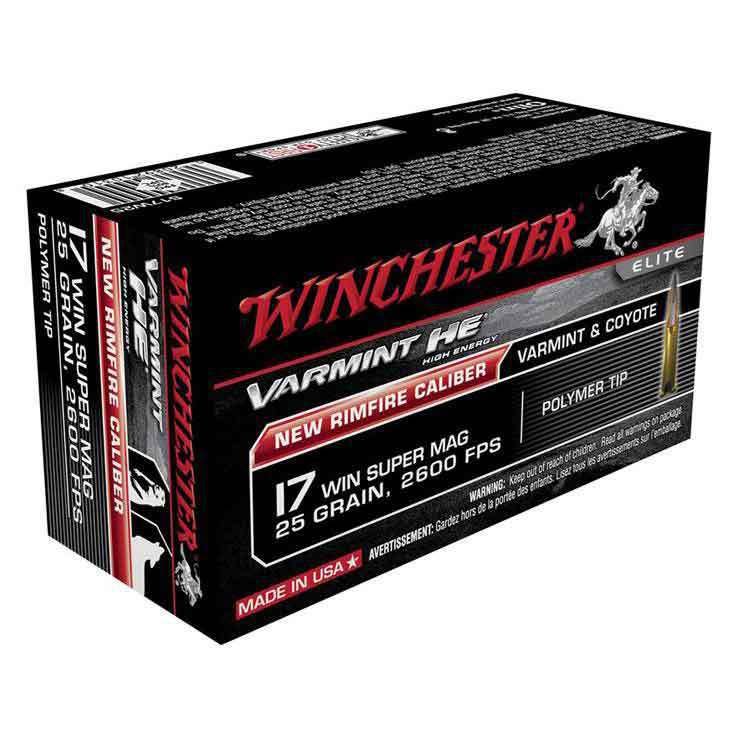 Winchester 17 Win Super Mag 25 grain Varmint HE Rimfire Ammo – This 17 Win Super Mag High Energy round offers maximum shock and deep penetration. The Ballistic Tip style round causes massive terminal upset.