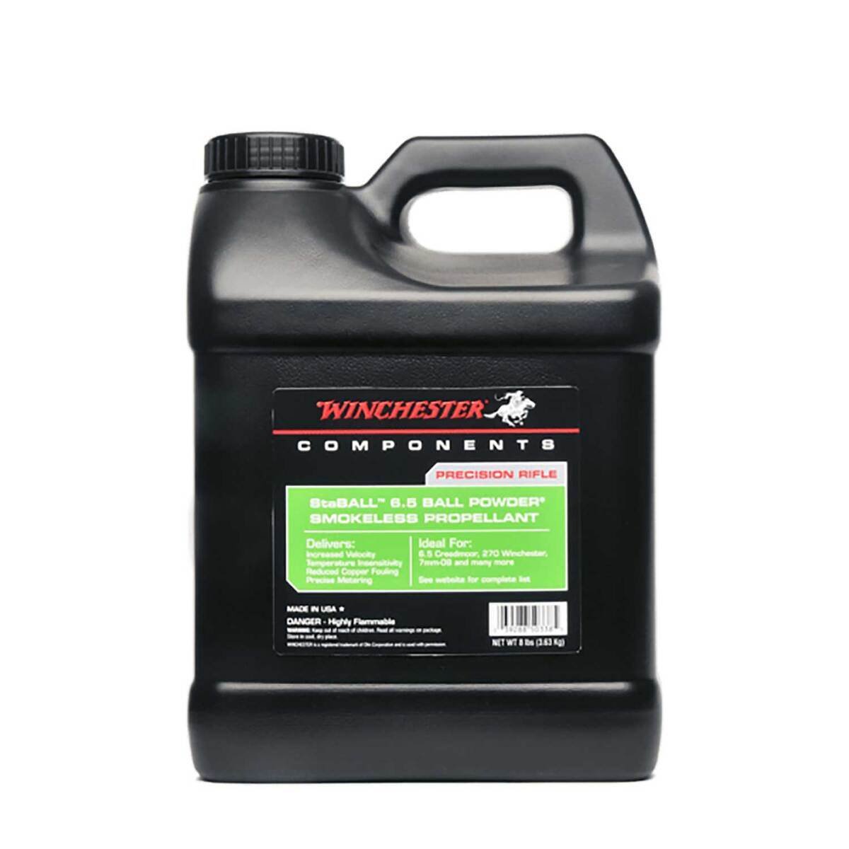 Winchester Staball 6.5 Smokeless Propellant Ball Powder – 8lbs – Winchester StaBALL 6.5 is the world’s first temperature-insensitive BALL Powder, stable in extreme-hot or -cold conditions. It provides optimal loading density in cartridges appropriate for the burn speed, which is ideal for 6 Creedmoor, 6GT, 6.5 Creedmoor, 7MM-08, 270 Winchester and many more. Typical of a ball powder, precise metering contributes to improved velocity and pressure standard deviations, ingredients that are paramount to match grade accuracy! This REACH-compliant, “environmentally green” propellant has copper fouling reducer additives, meaning longer durations of competition and field shooting without having to clean the bore. Precision accuracy throughout the match! Velocity levels obtainable, depending on the cartridge, are 30-200 fps greater than other propellants in its class. Stability, Precision and Speed, says Winchester StaBALL 6.5 is the “Best of the Best”!