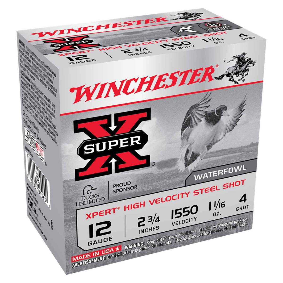 Winchester Super-X Xpert High Velocity Steel Shot 12 Gauge 2-3/4in #4 1-1/16oz Waterfowl Shotshells – 25 Rounds – Since 1922, Super-X ammunition has provided exceptional quality and outstanding performance for all types of hunters and shooters who rely on its time-proven dependability. These High Velocity Steel Shot shotshells offer more energy per pellet for increased range and shorter leads, resulting in greater termi