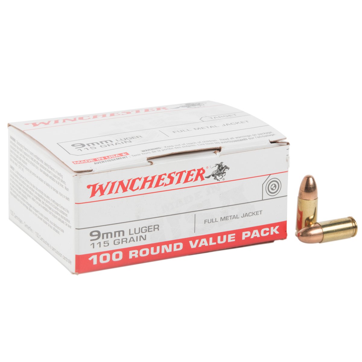 Winchester Target 9mm Luger 115gr FMJ Handgun Ammo – 100 Rounds – These full metal jacket bulk packs are perfect for target practice. They have Winchester’s trusted, consistent accuracy and reduced barrel fouling for fewer cleanings and more range time. The 115gr bullet sports a muzzle velocity of 1,190 fps and 362 ft. lbs. of energy. At 100 rounds per box, the price is right for a long day at the range!