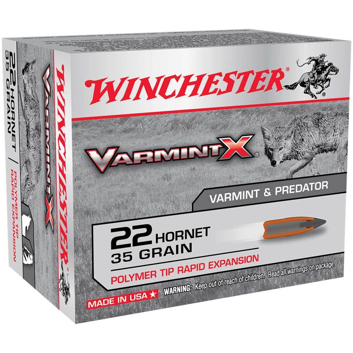 Winchester Varmint X 22 Hornet 35gr Rifle Ammo – 20 Rounds – Varmint X is designed specifically for the demands of predator and varmint hunters. The sleek, polymer-tipped bullets are explosive upon impact. Varmint X combines the proven dependability Winchester is known for with today’s latest technology, providing hunters the ammunition of choice for pursuing everything from prairie dogs to coyotes.
